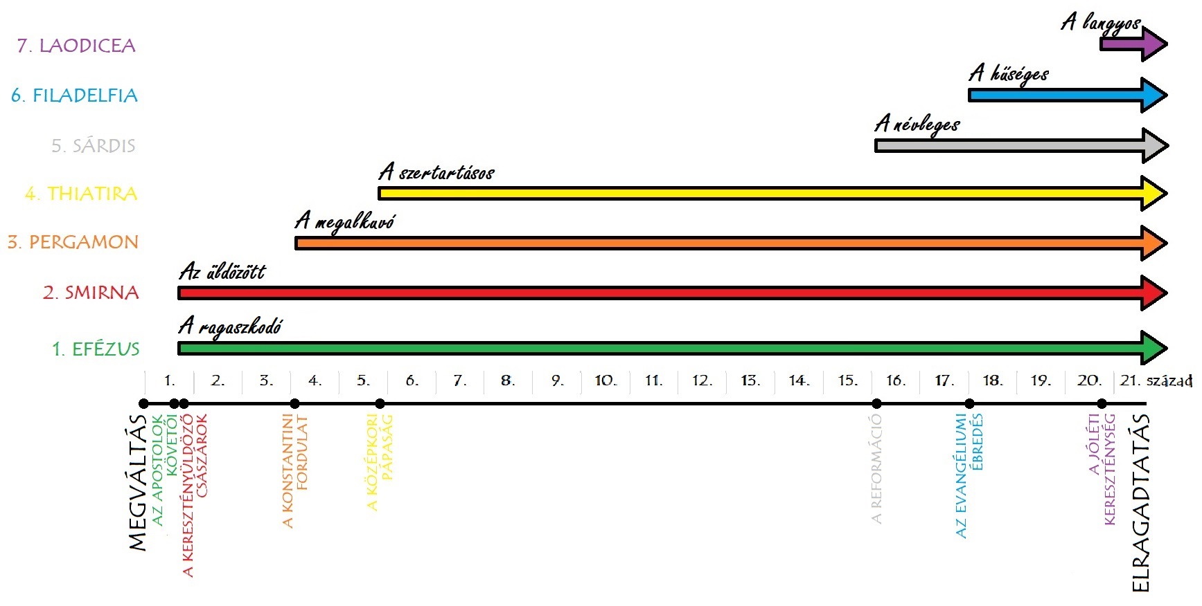 Az egyes keresztény típusok nem egyszerre jelentek meg a történelem színpadán, hanem fokozatosan, egymást követve léptek színre az Egyház egyes korszakaiban, a megváltástól az elragadtatásig. Azután az egyes típusok nem tűntek el a korszakok váltásakor, hanem fokozatosan egymás mellé társultak, és azóta is egymás mellett léteznek. Vagyis ma már egyszerre találkozhatunk mind a hét típusú hívővel, illetve közösséggel.