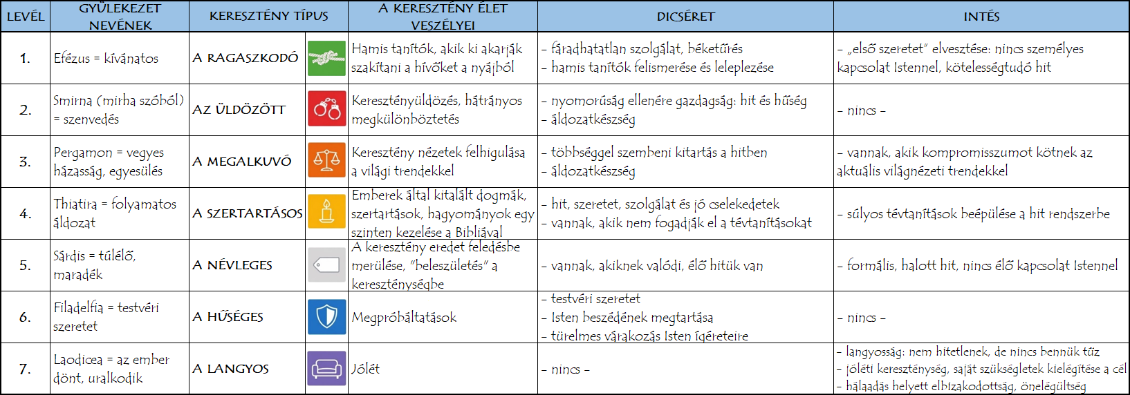 A hét keresztény típus alábbi leírása alapján mindenki eldöntheti, hogy ő maga a kereszténységen belül melyik típushoz tartozik. Fontos, hogy ezek a típus leírások nem egy-egy konkrét felekezetre vonatkoznak, hanem igazak lehetnek bármely keresztény közösségre, illetve a közösségek bármely tagjára. Akár ugyanabban a közösségben is jelen lehet többféle keresztény típus egyszerre. Jézus a levelekben megtérésre szólítja az egyes típusokat, tévedés tehát azt hinni, hogy keresztényeknek nincs szüksége megtérésre. Sőt, a jó hír éppen az, hogy Jézus nem mondott le egyikünkről sem, senki sincs végleg beskatulyázva abba a típusba, ahová jelenleg sorolná magát, hanem lehetősége van megtérni belőle. Éppen ezért fontos, hogy mindegyikünk feltegye magának a kérdést: vajon azon az úton járunk-e, amit Jézus annak idején kijelölt az Egyház számára?