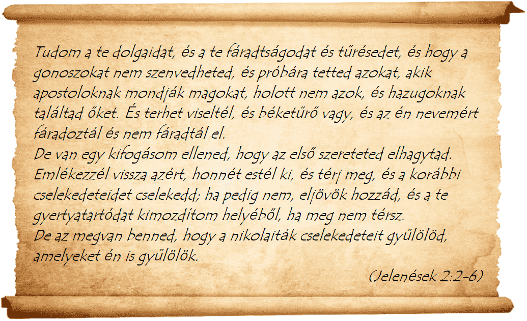 Jézus a levélben megdicsérte a gyülekezetet a fáradhatatlan szolgálatukért, a béketűrésükért és amiért gyűlölik és leleplezik a "nikolaiták" egyre terjedő hamis szolgálatát. A nikolaita szó jelentése: Isten népét elnyomó. Az ebben a korszakban kialakuló papságról van itt szó, akik az apostolok helyébe léptették magukat, de a tevékenységük már semmiben sem hasonlított a hajdani apostolokéhoz, mivel nem álltak a Szent Szellem vezetése alatt, és a tekintélyükkel visszaélve elnyomták a hívőket.