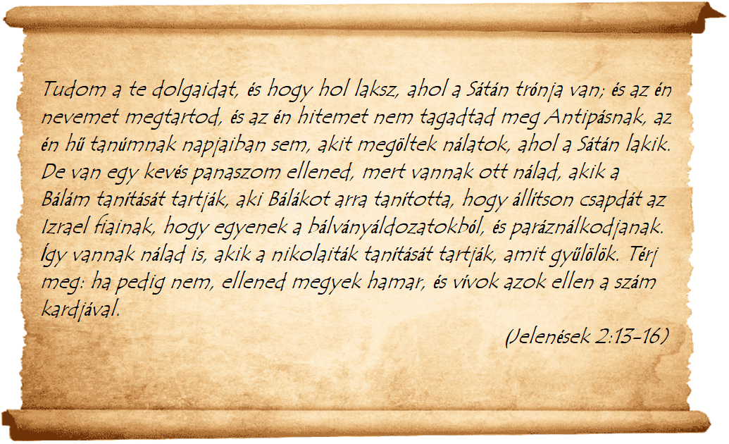 A levélben említésre kerül a korabeli Pergamon városában található "Sátán trónja"-t, mely arra a hatalmas Zeusz-oltárra vonatkozhat, ahol a görög-római istenségeknek áldoztak évszázadokon át. Jézus megdicséri azokat a pergamoni hívőket, akik ebben a környezetben is megtartották az eredeti hitüket.