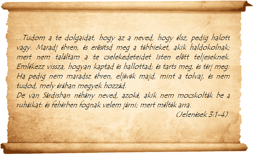 Az ötödik levélben a sárdisi keresztény típussal ismerkedhetünk meg. A sárdisi levél Jézus egyik legkeményebb üzenete: egy élőnek tűnő, vagyis külsőre sikeres, jó hírnevű keresztény közösség Isten szemében lehet teljesen halott. Jézus úgy fogalmaz, hogy halottak, bár a nevük jelentése az, hogy élő. A sárdis szó ugyanis túlélőt, maradékot jelent. A sárdisi keresztény belső hitélete elhalt, nem olvassa a Bibliát, nem érti, mit jelent az Úrral való élő kapcsolat. Kereszténynek tekinti magát, de nem érti, nem érzi ennek jelentőségét. Az egyháztagság számára csak formalitás, tartalom nélküli vallásosság, ún. vasárnapi kereszténység. Az élete valójában semmiben sem különbözik egy nem hívő ember életétől, miközben úgy hiszi, hogy az egyháztagsága önmagában is automatikus belépő a mennybe.