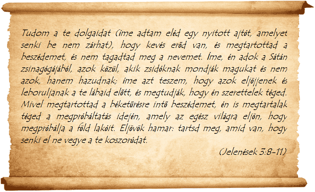 Jézus az ajtó előtt áll – ez vonatkozhat az elragadtatásra is, mely közel van, s ezzel zárul majd le az utolsó egyháztörténeti korszak.