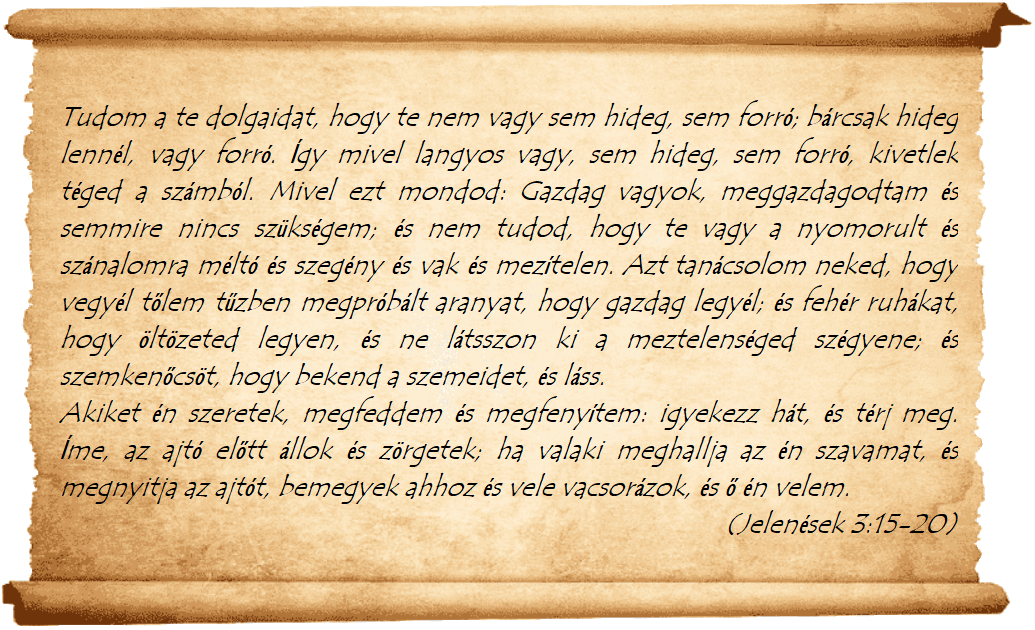 Jézus a laodiceai keresztényekről semmi jót nem mond. Viszont meglepő módon épp nekik mondja azt, hogy szeretetből feddi őket. Azt kéri, térjenek meg, és engedjék be Őt az életükbe, s ha megnyitják előtte az ajtót, akkor bemegy hozzájuk és velük vacsorázik. Ez a csodálatos ígéret külön a laodiceaiaknak szól. A közös étkezés a bibliai kultúrában szent dolognak számított: ha valakivel egy asztalhoz ültek, azzal kifejezték, hogy közösséget vállalnak vele. Jézus tehát nem felületes látogatást ígér, hanem mély, meghitt együttlétet. Jézus az asztalközösség képével hívja a langyos keresztényt a vele való szeretetkapcsolatba. Bár a levél az egész gyülekezetnek szól, ez az ígéret személyes: bárki dönthet úgy, hogy kinyitja az ajtót Jézus előtt.